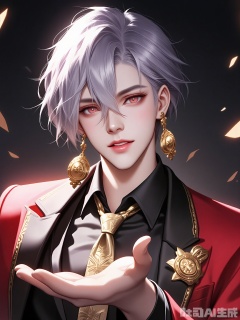 HTTX, Digital art of a young man with short, spiky, lavender hair, wearing a red blazer over a black suit with gold accents, a white shirt, and a gold-patterned tie. He has a confident, almost smug expression, with his hand outstretched, palm up, as if offering something. Large, ornate gold earrings and a matching gold earring on his left ear. The background is dark, with a subtle glow around his hand, giving a mystical or magical feel. The art style is detailed and semi-realistic, with a focus on the character's expression and attire.