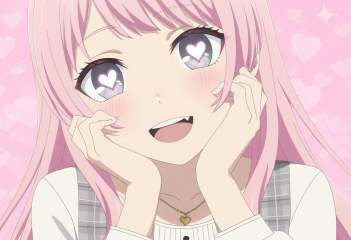 masterpiece,best quality,very aesthetic,absurdres,newest,no lineart,portrait,1girl,close-up,flat color,upper body,eye focus,sparkle,blush,<lora:anon:1>,anon,light blue-gray eyes,pink hair,asymmetric bangs,cut sideburns,diyitao,grey plaid dresses,gold heart necklace,long sleeves,pinafore dress,white shirt,look at looking at viewer,heart-shaped pupils,one fang,:d,upper teeth only,head_tilt,hands together,hands on right face,pink background,love background,