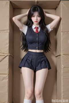 Masterpiece, the best quality, high quality, huge breasts,,(black hair:1.4),(long legs:1.3),(thin legs:1.4),1 girl, alone, in a container, black hair, box, tied, in a box, rope, school_uniform, tied, abusive, long hair, arms raised, dress, socks, armpits, cardboard boxes, realistic, lying down, looking at the audience,mini_skirt, japanese tying, , tied wrist