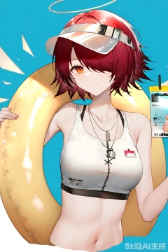 1girl, exusiai \(arknights\), solo, red hair, short hair, upper body, halo, looking at viewer, white background, visor cap, smile, swim ring, holding, simple background, innertube, necklace, jewelry, crop top, bare shoulders, orange eyes, hair over one eye, cropped torso