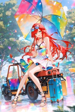 (Masterpiece), (Best Quality),(Chocoan:0.5),(Mika Pikazo:0.4),(wlop:0.4),Illustration, Depth of Field, (Color),masterpiece,best quality,high quality,extremely detailed CG unity 8k wallpaper,extremely detailed,High Detail,vibrant colors,anime style,cover art,extreme aesthetic,masterpiece,best quality,good quality,newest,very aesthetic,absurdres,Visual impact,32K UHD,colorful,sharp focus,impactful picture,offcial art, , 1girl, solo, long hair, looking at viewer, smile, open mouth, dress, holding, sitting, swimsuit, red hair, outdoors, pointy ears, tree, umbrella, sandals, ground vehicle, eyewear on head, suitcase