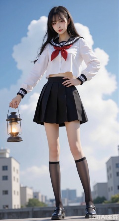 1girl, solo, long hair, skirt, shirt, black hair, long sleeves, holding, closed mouth, school uniform, standing, closed eyes, pleated skirt, outdoors, sky, serafuku, socks, cloud, black skirt, sailor collar, lips, neckerchief, kneehighs, black socks, building, red neckerchief, black serafuku, lantern, city, realistic, giantess, holding lantern