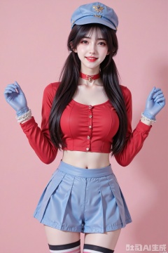 Masterpiece, top quality, high quality, (colorful), small chest, (black hair: 1.4), (long legs:1.4),1girl, solo, long hair, breasts, looking at viewer, blush, smile, open mouth, bangs, skirt, large breasts, shirt, black hair, thighhighs, gloves, long sleeves, hat, navel, cleavage, collarbone, ponytail, cowboy shot, pleated skirt, choker, midriff, striped, miniskirt, black eyes, blue skirt, zettai ryouiki, crop top, pink background, red shirt, striped thighhighs, two-tone background, blue headwear, blue gloves, cabbie hat, red choker