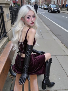 A girl with white long wavy hair and fair skin, sitting lazily on a bench by the roadside, turned her body and looked back at the camera. Her facial features were very beautiful, with makeup, smoked makeup, velvet vest skirt, designer style, long leather boots, necklace, velvet black gloves, fashionable and cool temperament. Her background was on the streets, mailboxes, fences, stone walls, pedestrians and cars of the United States. The camera used a top-down perspective to create a masterpiece