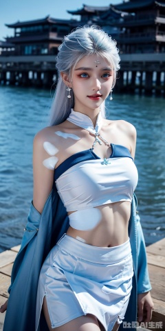 1girl, solo, long hair, , looking at viewer, skirt, hair ornament, bare shoulders, jewelry, , earrings, outdoors, midriff, water, necklace, lips, crop top, leaning forward, ocean, white skirt, strapless vest, sunset, sun,zhihua,white hair,blue eyes