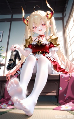 artist:Komachan,battlemage_neopresencia,1girl,solo,gradient hair,blonde hair,long hair,ahoge,red eyes,horns,twintails,pointy ears,Kimono,armor,feathers,gold trim, unworn_shoes, feet, no_shoes, soles, dress, white_pantyhose, pantyhose, solo, foot_focus, toes, shoes, looking_at_viewer, short_sleeves, holding_shoes, sitting, foreshortening, holding, open_mouth, belt, smell, neck_ribbon, blush, frills, high heels, steaming_body, indoors, smile