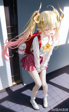 battlemage_neopresencia,1girl,solo,gradient hair,blonde hair,long hair,ahoge,red eyes,horns,twintails,pointy ears, looking at viewer, blush, open mouth, bangs, skirt, shirt, long sleeves, bow, ribbon, holding, hair between eyes, twintails, school uniform, standing, collarbone, full body, pleated skirt, shoes, socks, collared shirt, indoors, tears, miniskirt, bag, leaning forward, red skirt, watermark, white footwear, backpack, blue shirt, yellow bow, between legs, pink skirt, v arms, hand between legs, yellow ribbon, tiles, holding bag, tile floor, have to pee,half-closed eyes,
