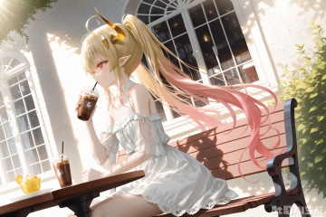 long eyelashes,colored eyelashes,floating hair,see-through clothes,lace,dynamic angle,dynamic pose,Dynamic hair, holding drink, drink, casual outfit, white top, sitting, outdoor, table, looking away, sitting at table, holding cup, holding plastic cup, holding iced coffee, sitting on bench, white wall, window, sunlight, shadow, day, summer,