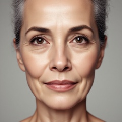 A surreal close-up portrait of a 80-year-old woman looking straight into the camera with a calm and confident expression. Smooth skin,clean skin. The background is neutral and fully focused on her upper body.. ***** in a professional studio using Hasselblad H6D-100c,100mm f/2.2 lens,high-end editing photography,clear details,and soft directional lighting to enhance skin texture.,