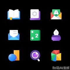 PMUI, A digital illustration featuring nine colorful, flat icon-style images on a black background. The icons include a book, a calendar, a file folder, a green chart, an envelope, a plus sign, a speech bubble, a purple circle, and a colorful pie chart. The icons are arranged in a 3x3 grid, each with a distinct color and design. The illustration is simple and modern, with a minimalistic style.