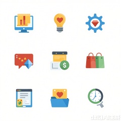 PMUI, A digital illustration featuring nine colorful icons in a 3x3 grid on a white background. The icons include a computer screen with a data chart, a lightbulb with a heart, a gear with a document, a diamond, a browser with a search result, a shopping bag, a clock, a speech bubble with a heart, and a thought bubble with a dollar sign. The icons are simple, clean, and vibrant, using a flat design style. The overall aesthetic is modern and playful.
