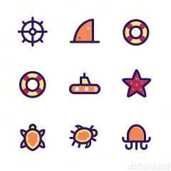 PMUI, A simple, colorful digital drawing featuring nine nautical-themed icons arranged in a 3x3 grid. The icons include a compass, a shark fin, a dolphin, a lifebuoy, a starfish, a submarine, a fish, a turtle, and a jellyfish. Each icon is outlined in a thick, purple line and filled with a mix of bright colors like orange, yellow, and red. The background is plain white, making the icons stand out clearly. The style is playful and cartoony, with a focus on bold shapes and vibrant colors.