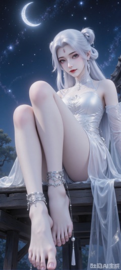 In the photo, a young woman sits on a wooden platform with her legs crossed. She was wearing a white low-neck long-sleeved dress. Her white hair was half upward and half downward. She wore a pair of silver bracelets on her wrist and a tassel hanging on one toe. The background is a night sky full of stars and crescent moon. The overall atmosphere of the picture is mysterious and dreamy.