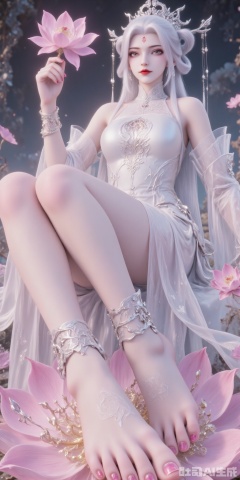 A digital artwork depicts a slim, fair-skinned woman with long white hair and tied into a ponytail. Her skirt has delicate lace details and a deep V-neck. Her left arm was wearing a huge and gorgeous handguard. She held a pink lotus in her right hand. She sat barefoot on a pink lotus, lifting one foot to reveal the soles of her feet, and there were accessories on her feet.