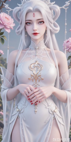 wavy blonde hair and blue eyes is adorned with a red star on her forehead. She is wearing a white strapless dress adorned with gold embroidery and a white choker around her neck. Her dress is adorned in a flowing pattern of gold and white feathers. Her hands are adorned with red nail polish