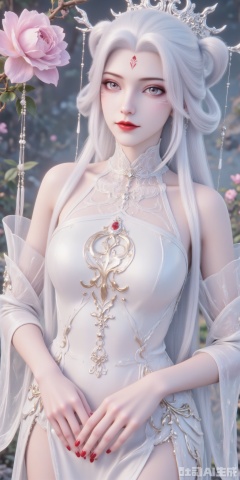 wavy blonde hair and blue eyes is adorned with a red star on her forehead. She is wearing a white strapless dress adorned with gold embroidery and a white choker around her neck. Her dress is adorned in a flowing pattern of gold and white feathers. Her hands are adorned with red nail polish