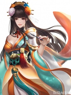 GFRW, A digital illustration of a beautiful woman in traditional Japanese attire, standing against a plain white background. She has long, flowing dark hair adorned with ornate hair accessories, including a large, detailed floral headpiece. Her outfit is a richly colored kimono with intricate patterns and a large, decorative obi belt. She holds a pair of scissors in her right hand, suggesting she is a seamstress or tailor. Her expression is calm and confident, with a slight smile. The artwork is highly detailed, with a focus on the textures and colors of the fabric and the delicate features of the character.