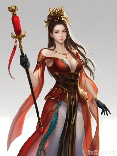 GFRW, Digital illustration of a woman with long, flowing brown hair, wearing a red and gold dress with intricate designs and a plunging neckline. She has a crown on her head and is holding a scepter in her right hand. Her left hand is adorned with a black glove. The background is plain white. The art style is detailed and realistic, with a focus on the character's regal and elegant appearance.