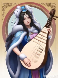 GFRW, A digital illustration of a woman playing a guqin, an ancient Chinese zither. She has long, flowing black hair adorned with a blue and gold headdress, and wears a luxurious, blue and gold robe with a fur-trimmed cape. Her expression is serene and focused as she plays the instrument. The background is white, and the image has a soft, ethereal quality.