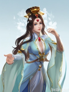 GFRW, A digital illustration of a young woman with long, flowing brown hair styled in an elegant updo, adorned with a golden crown and white flowers. She wears a luxurious, intricate blue and white gown with gold accents, featuring a high collar, long sleeves, and a deep neckline that reveals her cleavage. The dress is embellished with delicate, floral patterns and a large red gemstone at the waist. She stands confidently, one hand resting on her hip and the other outstretched, gesturing gracefully. The background is plain white, emphasizing the character. The art style is detailed and realistic, with a fantasy aesthetic.