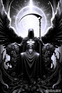 The image is a black and white illustration of a person sitting on a throne with a scythe in their hand