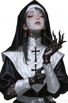 She is wearing a black and white outfit with a hooded cloak and a cross on her chest