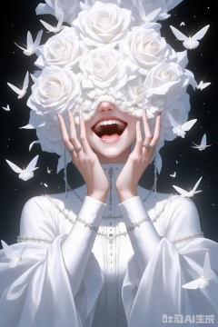 She has a large white flower crown on her head, covering her eyes