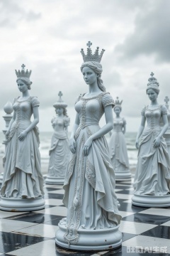 Behind her, there are several other chess pieces that are also made of white marble and are arranged in a line