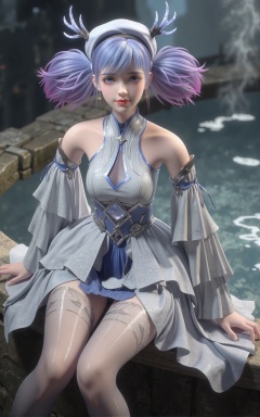Tutu Aurora 8D Pantyhose (the name is a trigger word), Generate an elegant and serene image of Xiaolu — a female character inspired by East Asian aesthetics. She is sitting beside a tranquil hot spring, with steam gently rising around her. The scene has a soft, warm glow that highlights her delicate features.  Xiaolu has long purple hair styled in twin tails or pigtails, some strands are lavender with purple tips, others dyed blue or pink. Her bangs frame her face as she looks directly at the viewer with a gentle, confident smile that conveys both grace and charm.  Instead of a swimsuit, she wears a white and silver futuristic fantasy outfit: a high-collar dress with off-shoulder sleeves, a frilly skirt, and thigh-high stockings. Accessories include an ornate headpiece, feather-adorned hat, silver choker, large earrings, and intricate jewelry with elaborate patterns. Despite the modest attire, her poised posture and expression convey a subtle sense of elegance and allure.  The setting is dreamy and atmospheric, with warm lighting reflecting on the water's surface and surrounding rocks. The overall mood is peaceful yet captivating, blending sensuality with refinement.  The image should be rich in detail, emphasizing fabric texture, lighting effects, and facial expression. tutu Aurora 8D Pantyhose