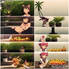 1girl, animal_ears, bangle, bracelet, food, fruit, green_eyes, green_wings, jewelry, knees_up, leaf, long_hair, palm_tree, pink_hair, plant, popsicle, potted_plant, shirt, shoes, short_sleeves, sitting, sneakers, solo, tail, watch, white_shirt, wristband, wristwatch