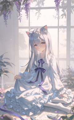 masterpiece,very aware,highres,absurdres,newest,best quality,loli,petite,high quality,chromatic_aberration,cinematic_angle,dutch angle, nyalia, //,artist:ciloranko,artist:ningen_mame,artist:sho_(sho_lwlw),artist:rhasta,artist:wlop,artist:ke-ta,artist:hiten \(hitenkei\),//1girl, white dress, cat ears, solo, off-shoulder dress, purple flower, blush, animal ear fluff, looking at viewer, fish, ahoge, yokozuwari, wisteria, smile, no shoes, purple ribbon, closed mouth, bare shoulders, very long hair, sleeves past wrists, frilled dress, cat, hair between eyes, petals, neck ribbon, skirt hold, plant, crescent, puffy sleeves, white pantyhose, cat girl, watermark, white hair, grey hair, long sleeves, light particles, purple eyes, dutch angle, full body, water, greenhouse, glass wall, glass, day, white carpet, indoors, sitting, pink flower, loli<lora:maomao-000055:0.8>,