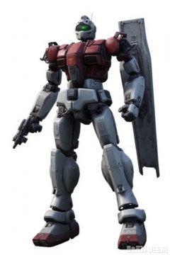 looking at viewer,full_armor,superrobet,Gundam,machinery,no_humans,robot,mecha,science_fiction,strong contrast,mechanical buddy universe,RGM_79_(Requiem_for_Vengeance_VER)