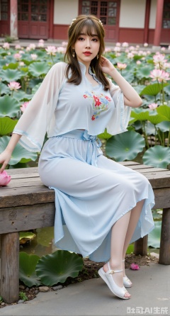 (masterpiece:1.2),best quality,The image is a digital illustration of a young woman sitting on a wooden bench in a pond with lily pads. She is wearing a long dress with design on the chest and sleeves. The dress has a high neckline and short sleeves,Holding a lotus in hand. She has long dark hair styled in loose waves and is wearing gold high heels. The woman is posing with one hand on her hip and the other resting on the edge of the bench. The background is filled with pink and white lotus flowers and green leaves. The overall mood of the image is peaceful and serene,(huge breasts:2.99),(full breasts:2.99),(Background with traditional Chinese architecture, lotus pond and pink lotus flowers:1.39),gechuanguangchongstyle,Xyuanxionggirl,Xyunxiao,XyunxiaoYK,Xdixionglianyiqun,Xmiaozufushi,Xqilinxianzi,XTifaLockhart,Xjinshenjianshenfu,Xbigbreasts,Xrixirenxiangsheying,XzhaoxiangerX,Xnanxiaochen2,Xyinyue2,Xchenjiajia,Xhanfusiwa