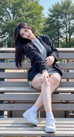 (masterpiece, best quality:1.2),,1girl,The image is a photograph taken outdoors,possibly in a park or public area,with a clear blue sky and lush greenery in the background. The subject is a young Asian woman with long,straight black hair,fair skin,and a slender physique. She is seated on a wooden bench with a casual,relaxed pose,leaning slightly to her right with her arms crossed. Her attire includes a black blazer over a grey sweater and a short grey skirt,paired with sheer black pantyhose and white athletic shoes with black stripes. She wears white socks that reach mid-calf,adding a playful touch to her look. The background features a metal fence and trees,with a serene atmosphere. The overall style is casual and modern,with a focus on youthful fashion.,(huge breasts:2.99), (full breasts:2.99),Xyujiafu,Xnanxiaochen,Xloubeimaoyi,Xrixisheyingfeng,Xinsstyle,Xliumengru