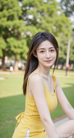 (masterpiece, best quality:1.2),,A photo-realistic portrait shoot from a portrait angle about a young woman with long dark hair smiling at the camera. the image also shows lush green trees and a blurred outdoor background. on the middle of the image, a 20-year-old asian woman with light skin and brown eyes appears to be smiling, wearing a yellow sleeveless top. she has a slim body and is looking directly at the viewer with her brown eyes. her long, dark brown hair falls down her back, and she is sitting on a grassy area with a blurred green background. the lighting is soft and natural, creating a serene atmosphere.(huge breasts:2.99), (full breasts:2.99),Xyujiafu,Xnanxiaochen,Xloubeimaoyi,Xrixisheyingfeng,Xinsstyle,Xliumengru