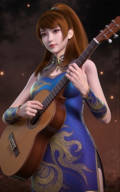 Tutu Aurora 8D Pantyhose (the name is a trigger word), Create a vibrant and expressive 3D illustration of Xiaoninger - a slender Asian woman with long, straight brown hair styled in a high ponytail, sometimes with a side braid. She has pale skin, red lips, and a graceful posture. She is depicted in full-body pose, playing a guitar with elegant hands. Her expression is calm yet engaging, eyes looking slightly toward the viewer or focused on her music. She wears an elegant blue and gold traditional Chinese qipao dress with intricate ornate patterns. The sleeveless design features a high collar and bare shoulders, accentuated with gold accents. Delicate black thigh-high stockings enhance the texture of her outfit. Accessories include blue and gold arm cuffs and a single gold earring. The overall style is inspired by Pixar animation - stylized realism with rich colors, soft lighting, and cinematic depth. The background features a bokeh effect with floating stars and soft lights, adding a magical and whimsical touch to the composition. Render in vivid, colorful tones with high detail and cinematic lighting. Tutu Aurora 8D Pantyhose.