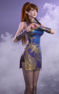 Tutu Aurora 8D Pantyhose (the name is a trigger word), Product portrait photography, Xiaoninger, long straight brown hair in high ponytail with side braid, pale skin, red lips, wearing an elegant blue and gold qipao dress, intricate patterns, sleeveless design, bare shoulders, knee-high boots, delicate black thigh-high stockings, holding a smartwatch close to the camera, simple background, soft lighting, shooting from a low angle upwards, wide-angle lens, perfect hands, top gradient background from purple to white, dynamic posture, commercial advertising, delicate skin texture, Tutu Aurora 8D Pantyhose.