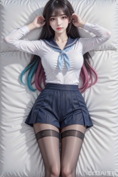 1girl, solo, breasts, looking at viewer, blush, black hair, bangs, blue eyes, shirt, long sleeves, closed mouth, school uniform, white shirt, longhair, pantyhose, lying, serafuku, on back, sailor collar, arms up, neckerchief, black pantyhose, on bed, no pants, thighband pantyhose, white sailor collar, blue neckerchief