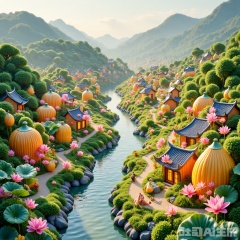 Chinese idyllic village, aerial view, food art composition: jade lotus leaves are laid into ripples ponds, golden grass and wood ash are roasted into wheat fields, dark green tofu blocks are turned into terraced stone slabs, three-color Zhuang Township flower rice is made into tiled roofs, and silver-scale rice flower fish jumps out between the rice ears. Soft watercolor style, blue tiles and white walls dotted among houses, morning mist sways distant mountains, saturated colors and natural textures, surreal food landscape, 8k details --ar 16:9 --v 6.0rt of ingredients