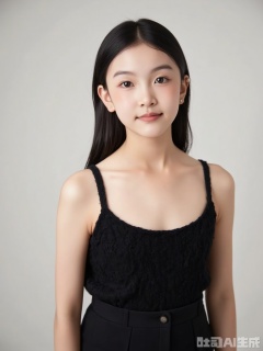 Character: Wearing a black off-shoulder knitted suspender, the shoulder lines are beautiful and natural, the neckline is fit, the chest is full, and the cleavage is appropriate, showing an elegant temperament without losing the sense of professionalism. The hair is folded and the simple pearl earrings are worn. The makeup is exquisite and elegant, the eyebrows are neat, the eyeshadow is natural, and the lipstick is soft. The expression is gentle and confident, the corners of his mouth are slightly raised, and his eyes look straight at the camera, showing a workplace image that combines affinity and professionalism.