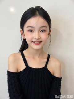 Character: Wearing a black off-shoulder knitted suspender, the shoulder lines are beautiful and natural, the neckline is fit, the chest is full, and the cleavage is appropriate, showing an elegant temperament without losing the sense of professionalism. The hair is folded and the simple pearl earrings are worn. The makeup is exquisite and elegant, the eyebrows are neat, the eyeshadow is natural, and the lipstick is soft. The expression is gentle and confident, the corners of his mouth are slightly raised, and his eyes look straight at the camera, showing a workplace image that combines affinity and professionalism.
