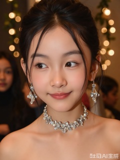 The image shows a young woman with dark hair styled in an elegant updo, adorned with a delicate necklace featuring floral designs. She is wearing matching earrings and a strapless top, suggesting a formal or evening event setting. The background is blurred, with warm, glowing lights creating a festive atmosphere, possibly indicating a party or celebration. The overall composition and lighting suggest a glamorous and sophisticated environment.