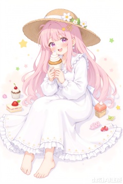 1girl, solo, looking at viewer, blush, smile, short hair, open mouth, bangs, hair ornament, long sleeves, hat, dress, holding, sitting, purple eyes, collarbone, pink hair, flower, :d, frills, food, barefoot, teeth, medium hair, pink eyes, star \(symbol\), white dress, feet, toes, fruit, upper teeth only, frilled dress, holding food, white flower, candy, puffy long sleeves, cake, lollipop, ice cream, strawberry, brown headwear, straw hat, hat flower, cherry, holding candy, cake slice, macaron, holding lollipop, cupcake, sweets, swirl lollipop