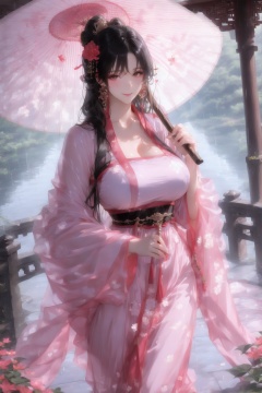 <lora:01仙媳第一版:1>,1girl,umbrella,flower,long hair,holding umbrella,solo,hair ornament,black hair,holding,hair flower,chinese clothes,breasts,hanfu,bug,dress,bridge,earrings,butterfly,oil-paper umbrella,jewelry,large breasts,outdoors,looking at viewer,rain,pink dress,long sleeves,smile,wide sleeves,very long hair,closed mouth,