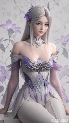 general, sfw, Glossy and violet flower background,1woman, Grey silver hair, solo, breast, exquisite skin, looking at viewer, sitting, very awa, masterpiece, best quality, highres, absurdres, newest, aesthetic,