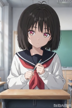 1girl, solo, looking at viewer, short hair, bangs, black hair, long sleeves, holding, school uniform, upper body, serafuku, indoors, sailor collar, blurry, sweater, neckerchief, red neckerchief, desk, classroom, school desk, pencil, chalkboard, school, holding pencil,masterpiece,best quality,official art,extremely detailed CG unity 8k wallpaper,