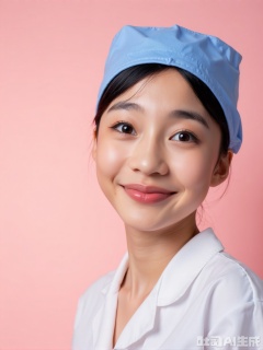 **People**: Wearing a white nurse's uniform and a blue nurse's hat (with the brim of the hat as close as the eyebrows), the hair is tied into the hat with a hair net, revealing the forehead and ears. The expression is gentle and friendly, the eyes are smiling, and the camera is looking at the camera, showing the patience and affinity of medical staff, with natural makeup and a strong complexion, which meets the hospital's standard requirements for the image of nurses.