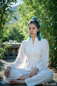 Character: A woman wearing a plain white modified Zen dress, her shirts drooped like flowing clouds, and her neckline and cuffs were covered with bamboo patterns. The blue hair is tied with a pine-shaped jade hairpin, and a few strands of broken hair are swaying with the mountain wind. She sat cross-legged under the shade of bamboo, with her hands in meditation seals, her eyes drooping, her face half-light and half-dark in the interweaving of bamboo shadows and sunlight, and her skin is like cream, blending with the aura of the bamboo forest, showing the quiet dialogue between the human body and nature.