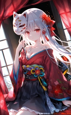 masterpiece,very aware,highres,absurdres,newest,best quality,loli,petite,high quality,chromatic_aberration,cinematic_angle,dutch angle,nyalia,//,artist:ciloranko,artist:ningen_mame,artist:sho_(sho_lwlw),artist:rhasta,artist:wlop,artist:ke-ta,artist:hiten \(hitenkei\),//,1girl, mask, long hair, breasts, solo, flower, white hair, cleavage, spider lily, hair ornament, very long hair, mask on head, tassel, red flower, red kimono, red eyes, oni mask, japanese clothes, hair flower, sash, holding mask, kimono, wide sleeves, large breasts, collarbone, bow, obi, long sleeves, closed mouth, bare shoulders, off shoulder, black skirt, fox mask, unworn mask, hair bow, watermark, dutch angle, skirt, hand up, sitting, artist name, expressionless, holding, english text, ribbon, indoors, red bow, pixiv id, curtains, sidelocks, hair between eyes, pleated skirt, cowboy shot, floating hair, hair ribbon, tassel hair ornament, flower knot, backlighting, medium breasts, blurry, looking at viewer, window, red ribbon, kanzashi, parted lips, frills, obijime, skull<lora:カズ-000040:0.8>,