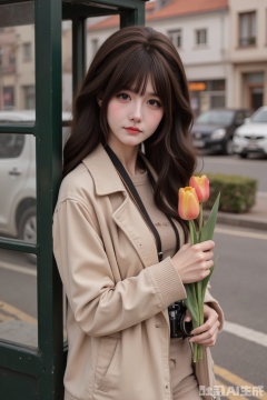 This is a Japanese -style portrait photography. In the picture, a woman is wearing a beige jacket and leaning on a dark green phone booth with a few bright tulips in her hand, her expression is gentle and quiet. There is a camera on her neck. The background is urban streets. There are vehicles and buildings. The overall atmosphere is literary and full of life, caught a beautiful moment in daily life.